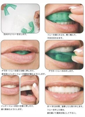 既成トレイにホワイトニングジェルが入っており、口腔内の体温によって熾烈に合わせ形が変形します。