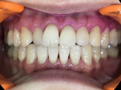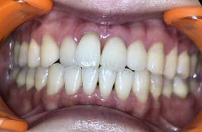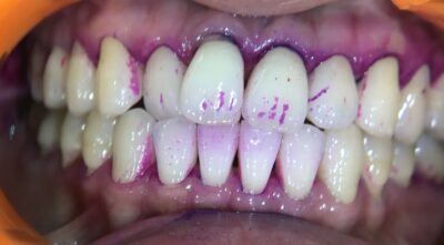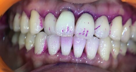 この患者様もきれいに見えますが、染めだすとやはり歯の根本に汚れが残っています😱