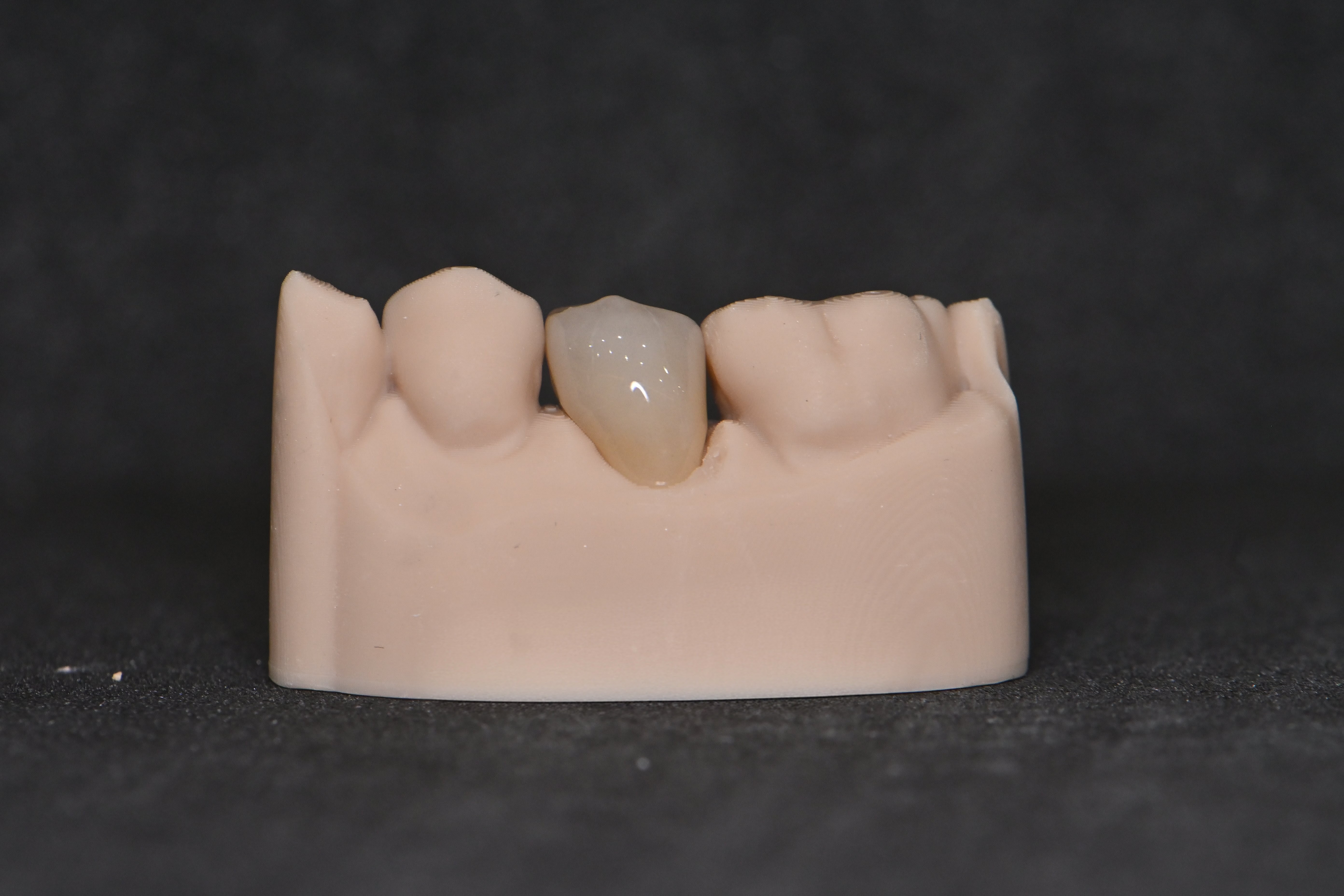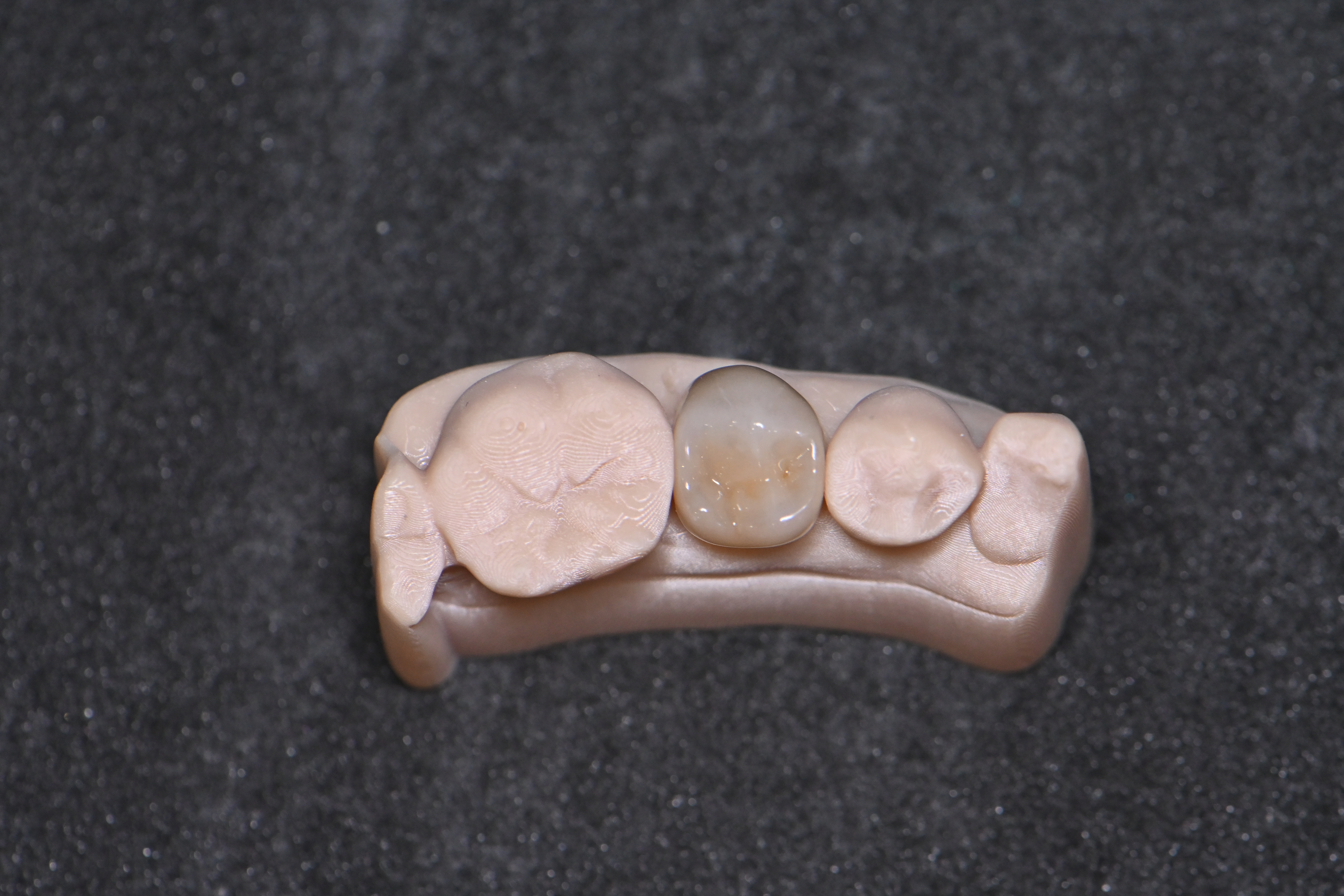 土台は金属にしてしまうと、しなりがなく根っこが破折するリスクがあるため、しなやかな弾性があるファイバーコアを、被せ物は強度と審美を兼ね備えたフルジルコニアを入れることになりました。